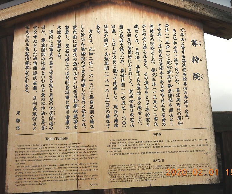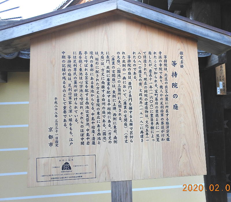 これは、南北朝時代の公家の日記である『師守記』(暦応2年9月1日条)には武衛(左兵衛督=足利直義)が坊門三条殿の等持院で父足利 貞氏追善の法華八講を主催したことが記されていることによる。ここに登場する等持院は後の等持寺のことで、その隣地には直義の三条坊門 殿があり、等持院も元は直義が一門のために建てた持仏堂であったと推定する考えである。康永元年(1342年)頃に等持院が諸山に叙せられ た際に寺号も等持寺と定められたという。 また法勝寺の恵鎮(円観)が等持寺にて足利直義に『太平記』を見せられたという逸話(『難太平記』)も当時の等持寺が直義ゆかりの寺院 であったと示すとされている。なお、後に直義は観応の擾乱によって滅亡し、坊門三条殿は尊氏の嫡男足利義詮の邸宅になり、等持寺も義詮 が管理するところとなった。直義建立説によれば、一連の戦乱で等持寺も大きな被害を受けたために尊氏は同寺を足利氏の菩提寺に相応しい ものに改築を行っているが、その際に寺伝を改竄して開山を夢窓疎石とするとともに、等持寺建立における直義と古先印元の事績を抹殺した としている。![]()
