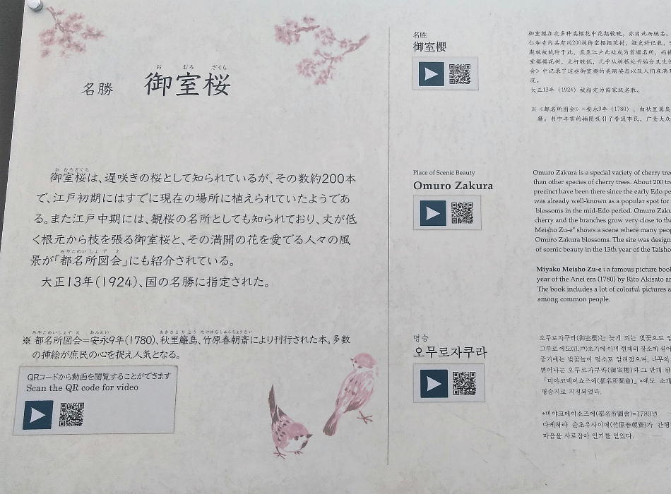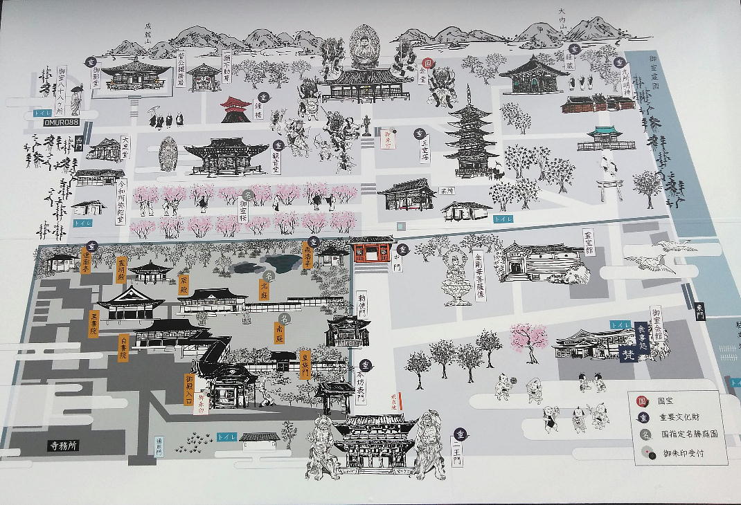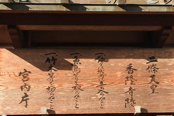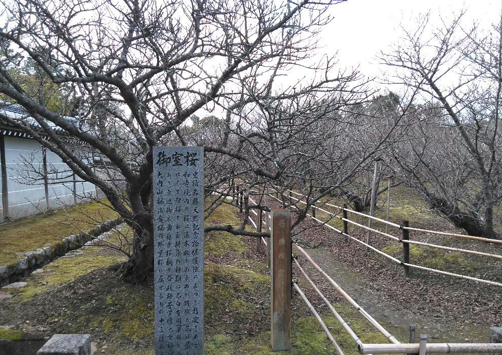 なお「御室」の旧地には現在、「仁和寺御殿」と称される御所風の建築群が建つ。御所跡地が国の史跡に指定されている。 仁和寺はその後も皇族や貴族の保護を受け、明治時代に至るまで、覚法法親王など皇子や皇族が歴代の門跡(住職)を務め(最後の皇族 出身の門跡は伏見宮純仁法親王、後の小松宮彰仁親王)、門跡寺院の筆頭として仏教各宗を統括していた。非皇族で仁和寺門跡になった 人物に九条道家の子法助と足利義満の子法尊の二名がいるが、ともに当時の朝廷における絶対的な権力者の息子でかつ後に准后に叙せら れるなど皇族門跡に匹敵する社会的地位を有していた。![]()