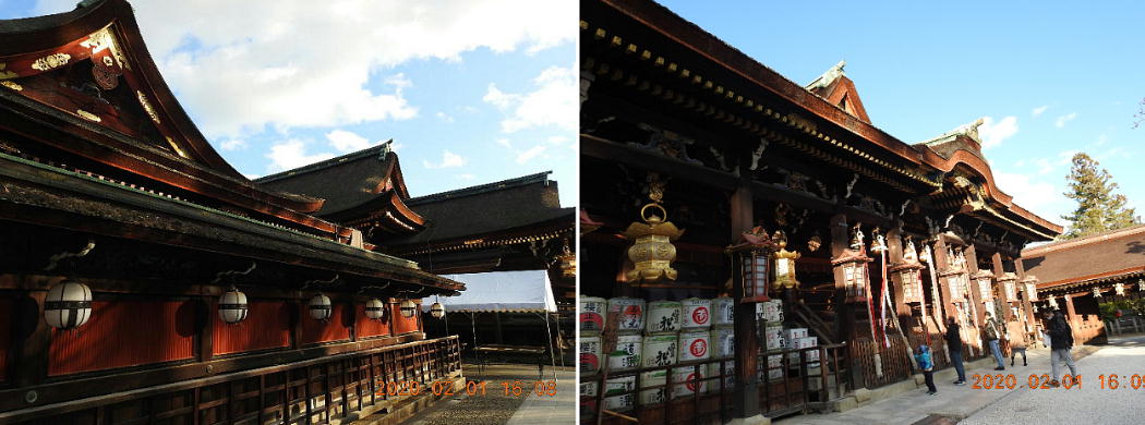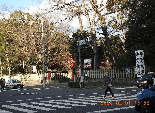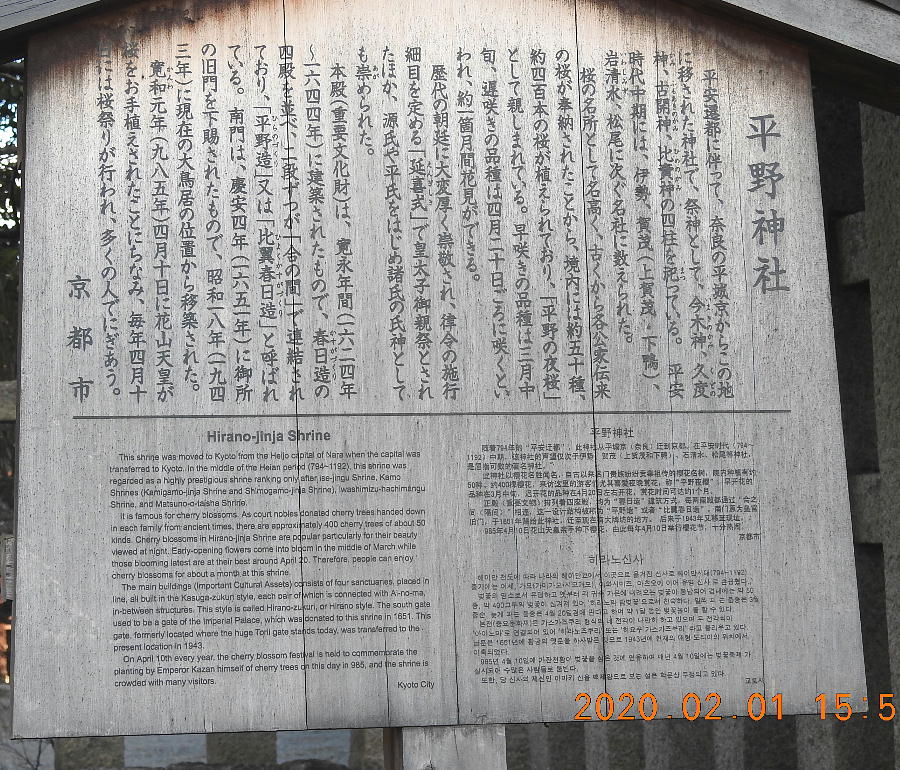 平野神社 出典: フリー百科事典『ウィキペディア(Wikipedia)』(以下、青字部分は全て。) 平野神社(ひらのじんじゃ)は、京都府京都市北区平野宮本町にある神社。式内社(名神大社)で、二十二社(上七社)の一社。旧社格 は官幣大社で、現在は神社本庁の別表神社。神紋は「桜」。 京都市北部、平安京大内裏(平安宮)から北方の平野の地に鎮座する神社である。平安京遷都頃まで創建が遡るとされる神社で、近年の 研究によると、元々は桓武天皇生母の高野新笠の祖神(桓武天皇外戚神)として平城京に祀られた神祠であったが、それが平安京遷都に 伴って大内裏近くに移し祀られたことに始まると推測されている。古代には皇太子守護の性格を持ち、平安時代には例祭「平野祭」にお いて皇太子自らにより奉幣が行われた。また、多くの臣籍降下氏族から氏神として歴史的に崇敬された神社としても知られる。 現在の本殿は4殿2棟からなり、いずれも「平野造」とも称される独特の形式の造りで、国の重要文化財に指定されている。そのほかに拝 殿・中門・南門・摂社縣神社は、京都府から文化財指定・登録を受けている。境内は桜の名所として知られ、夜桜の様子は「平野の夜桜」 と称されることで知られる。