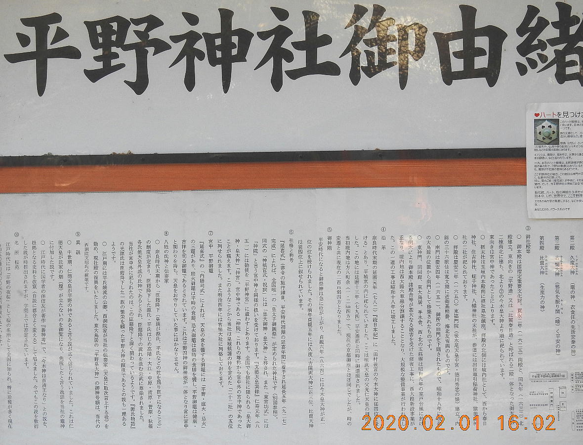 平野神社の創建について、『一代要記』では延暦13年(794年)、『諸神記』では延暦4年(785年)、『江家次第』では延暦年中、『本朝 月令』では延暦年中、『伊呂波字類抄』では延暦年中と記載する。公式の文献としては、貞観14年(872年)の太政官符では延暦年中の創 建の記載が、次いで延暦20年(801年)の官符では平野祭の記載があり、やはり延暦頃の鎮座が確認される。いずれにしても、一般的には、 平安京遷都から遠くない時期に創建されたものと考えられている。