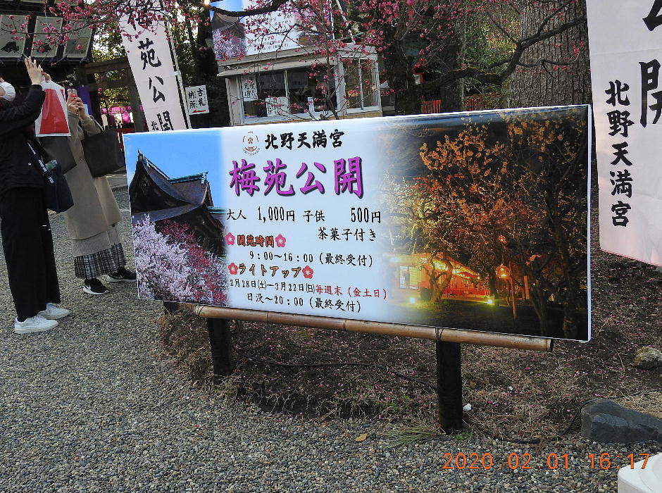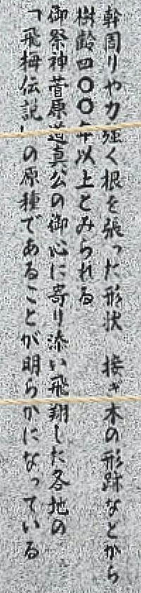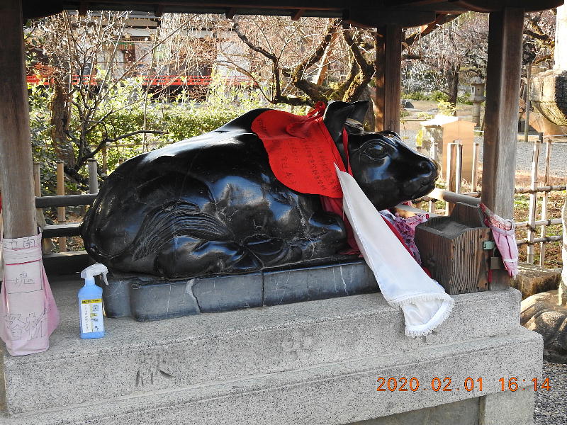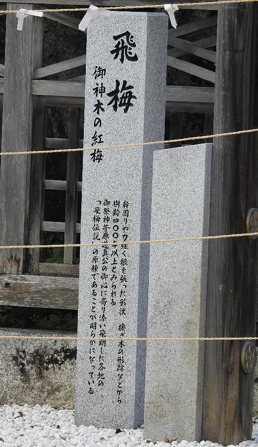 白梅と石の臥牛像 北野天満宮や菅原道真は、梅および牛との関係が深い。 東風吹かばにほひおこせよ梅の花 主なしとて春を忘るな −?菅原道真、拾遺和歌集 道真は梅をこよなく愛し、大宰府左遷の際、庭の梅に上記の和歌を詠んだことや、その梅が菅原道真を慕って一晩のうちに大宰府に飛来 したという飛梅伝説ができたことから梅が神紋となり、約2万坪の敷地には50種1500本の梅が植えられている。 このような菅原道真と梅との結びつきから、命日にあたる 2月25日に行われる梅花祭では「梅花御供(ばいかのごく)」とよばれる特殊 神饌が献供されている。これは明治以前に太陰暦が用いられていた時代には魂を「宥める」にあやかって菜種がささげられていたが、新 暦になり、梅花祭の時期が変わったために梅の花が用いられるようになったとされている。なお、2012年現在では梅花祭における菜種は、 神職が身に付け奉仕を行うという形で残されている。この神饌では白梅と紅梅を男と女に見立て、土器の上に仙花紙を筒状に丸めて乗せ、 玄米を流し入れた土台にそれぞれの梅の枝が挿し込まれ奉げられる。白梅を挿したものが42個作られこれを「男の御供」、紅梅を挿した ものを33個作り、「女の御供」と呼んでいる。また、菅原道真が大宰府へ流された際に帯同した従者が薨去以後遺品を京都へ持ち帰り、 鎮魂のために毎年収穫された米を奉げていたという伝承に基づき、大判御供、小判御供という形で現代においても神事が受け継がれてお り、その従者達の末裔である七保会の面々によって御調が行われている。くわえて、この梅花祭は全国でも珍しく、貞明皇后参拝の古例 に従って、天皇からでなく皇后から幣帛料が上げられている。 牛は天満宮において神使(祭神の使者)とされているが、その理由については「道真の出生年は丑年である」「亡くなったのが丑の月の 丑の日である」「道真は牛に乗り大宰府へ下った」「牛が刺客から道真を守った」「道真の墓所(太宰府天満宮)の位置は牛が決めた」 など多くの伝承があり、どれが真実なのか、それとも全て伝承に過ぎないのかは今となっては良くわからないものの、それらの伝承にち なみ北野天満宮には神使とされる臥牛の像が多数置かれている。伝承のうち「牛が刺客から道真を守った」というのは和気清麻呂を祭神 とする護王神社や和気神社の猪の伝承との関連性が強く認められる。