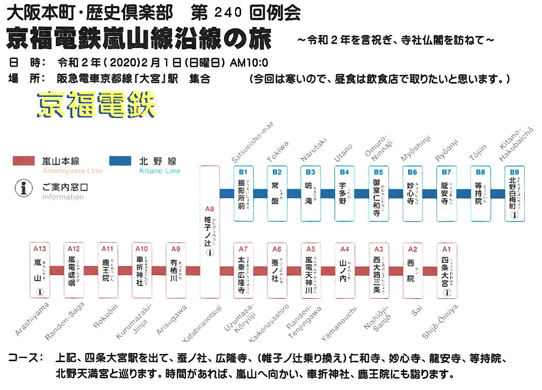大阪本町・歴史倶楽部 第240回例会 京都・嵐電沿線を歩く 2020.2.1(土)