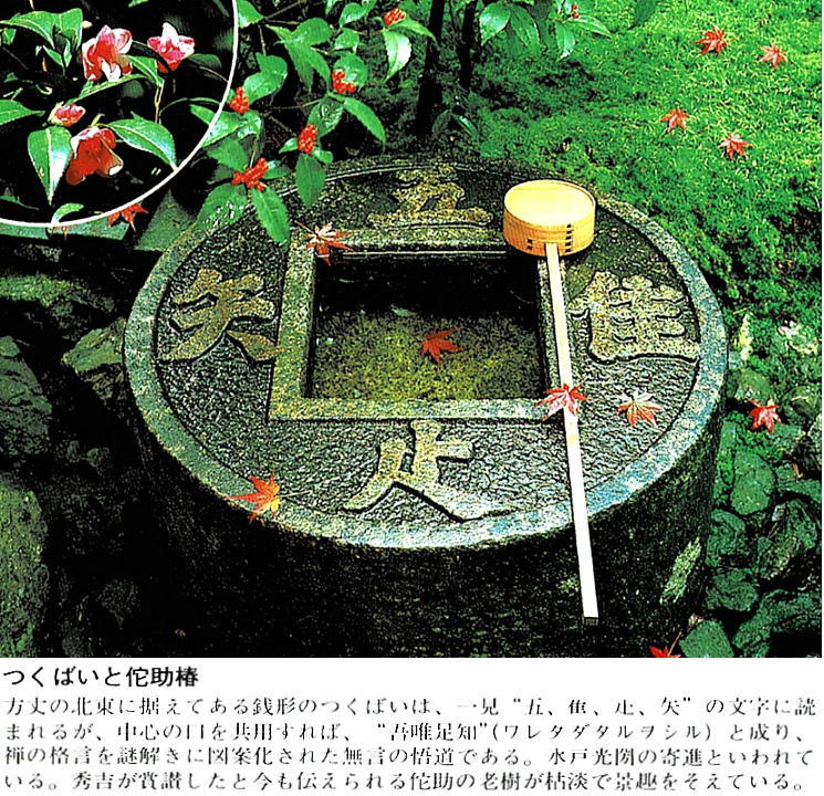 この庭は石の配置から「虎の子渡しの庭」や「七五三の庭」の別称がある。「虎の子渡し」とは、虎は、三匹の子供がいると、そのうち1匹 は必ずどう猛で、子虎だけで放っておくと、そのどう猛な子虎が他の子虎を食ってしまうという。そこで、母虎は三匹の虎を連れて大河を渡 る時は次のようにする。母虎はまず、どう猛な子虎を先に向こう岸に渡してから、いったん引き返す。次に、残った二匹のうち一匹を連れて 向こう岸に行くと、今度は、どう猛な子虎だけを連れて、ふたたび元の岸に戻る。その次に、三匹目の子虎を連れて向こう岸へ渡る。この時 点で元の岸にはどう猛な子1匹だけが残っているので、母虎は最後にこれを連れて向こう岸へ渡る、という中国の説話(虎、彪を引いて水を 渡る)に基づくものである。![]()