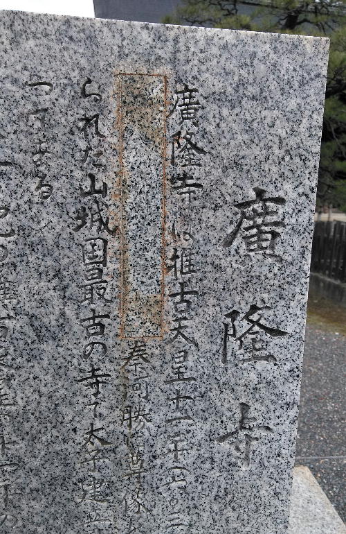 蜂岡寺の創建当初の所在地について、『承和縁起』には当初「九条河原里と荒見社里」にあったものが「五条荒蒔里」に移ったとあ る。確証はないが、7世紀前半の遺物を出土する京都市北区北野上白梅町(かみはくばいちょう)の北野廃寺跡が広隆寺(蜂岡寺) の旧地であり、平安京遷都と同時期に現在地の太秦へ移転(ないし2寺が合併)したとする説が有力である。![]()
