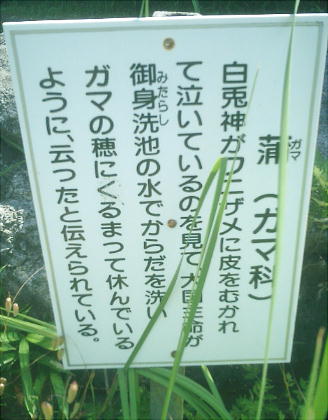 社として知られていて、近くに兎が体を洗ったと言う「御身洗池」や、くるまって身を包んだというガマの穂な