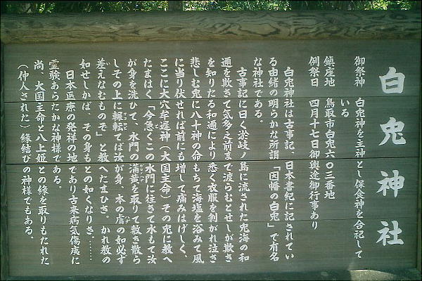 出典を求めることができるが、その兎を祀る神社としてここに白兎神社があり、その前の海岸は白兎海岸という