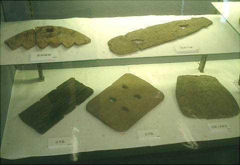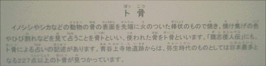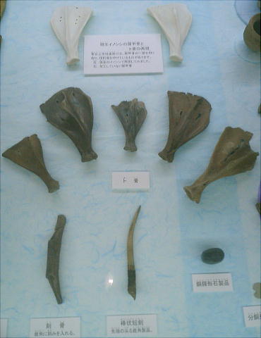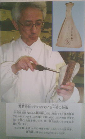 卜骨。シカやイノシシの肩甲骨を点状に焼いて、ヒビの入り具合などで占ったと考えられている。魏志倭人伝に