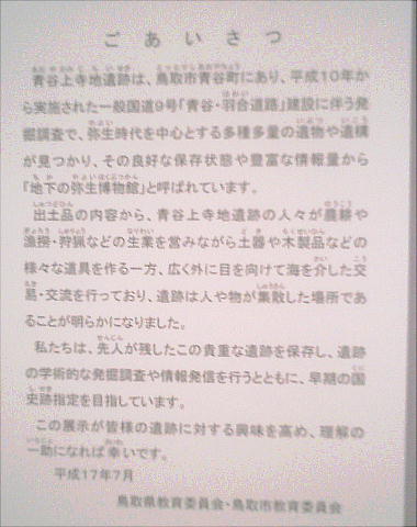 青谷上寺地遺跡は、鳥取市と倉吉市のほぼ中間、鳥取県青谷町(あおやちょう)にあり、JR山陰線「青谷駅」