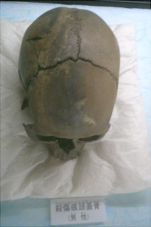 眉間に何かが刺さった痕跡を持つ頭蓋骨。