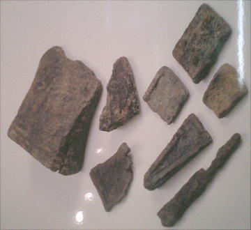 鏃や剣と考えられる石製の武器類。割れ口の鋭いガラス質の石を使っている。