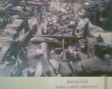 品、木製品、骨角製品なども出土しているし、微高地の東側区画の調査では、やはり溝の肩から矢板列が確