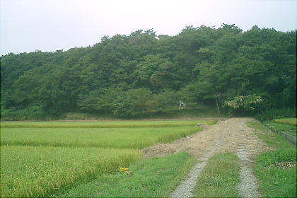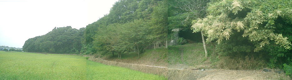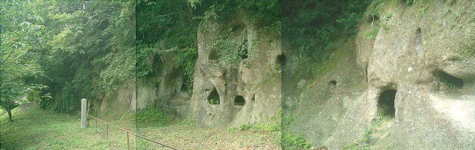 虎塚古墳の側から山道を下って行くと、台地が水田のある平地に下がっていき、その縁の部分に多くの横穴が開いている。整備