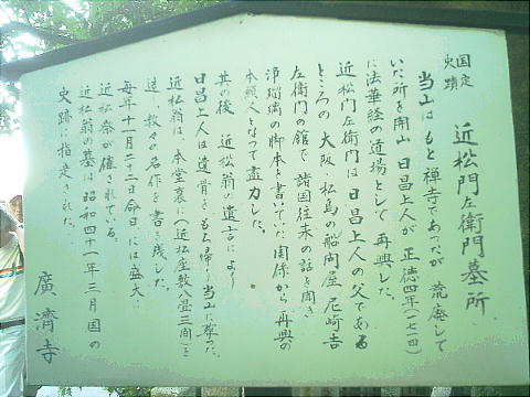 といわれるほど由緒正しい遺跡である。しかるに近松翁の墓所は同寺のほか、大阪谷町の妙法寺(誤植?)、九州唐津の近