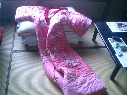 上右は、昨夜渡辺君が貸してくれた、どてらとも布団ともつかないような寝具。当然ながら、西日本にはない。