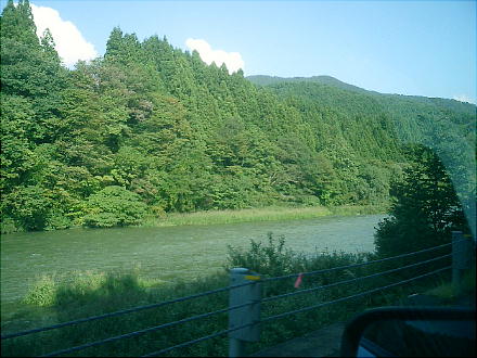 右折して三面川伝いに三面ダム方面を目指して走る。雄大な朝日連峰の山並みを眺めながら、朝日村を目指して行く。
