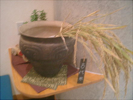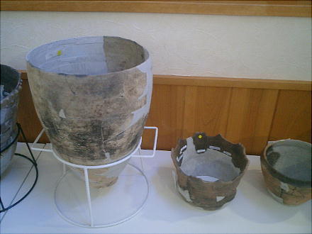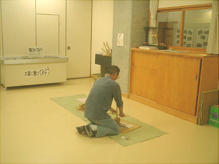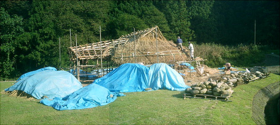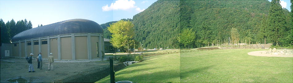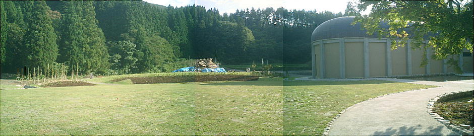 交流館の周りでは、まだ各種施設の整備中だった。芝生も根付いていないし、竪穴住居も屋根葺きの真っ最中である。今か