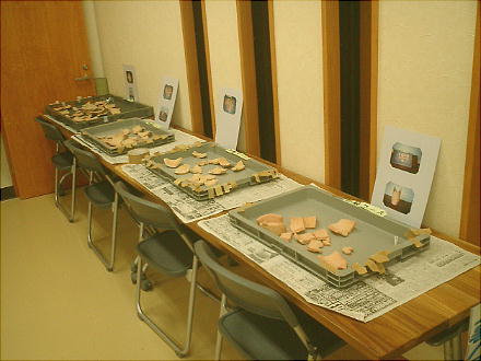 通路の両側に並ぶ出土品。この先が展示館になっている。