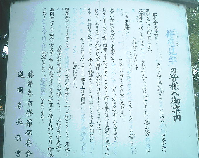 山門脇の土師窯跡の碑 <土師氏> 出雲氏と同じ天穂日命の後裔、野見宿禰が垂仁朝に埴輪を制作して殉死に代えた功により土師職に任ぜられる。三世孫身 臣は仁徳朝に改めて土師連姓を賜う。河内国志紀郡土師里を本拠として土師神社を祭る。後裔が桓武天皇の遠戚となるに 因り菅原、秋篠、大江(大枝)の三姓を分出して子孫は栄える。 * 上記の他【八島氏】【蒔田氏】【万代氏】【神部氏】【千島氏】【庵原氏】【毛受氏】【御井氏】が土師氏裔を称する。