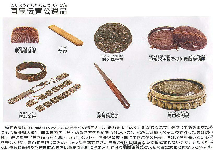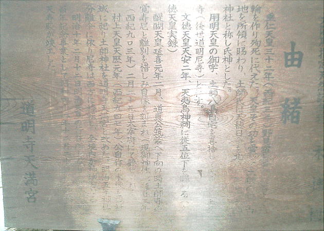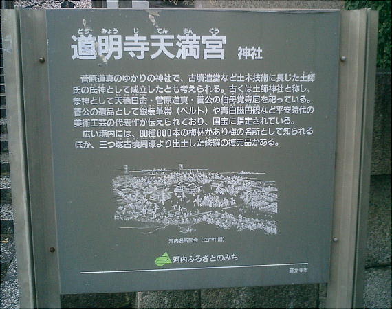 祭神 :菅原道真(すがわらのみちざね) 天穂日命(あめのほひのみこと:天照大神の子) 覚寿尼(かくじゅに:道真のおば) 由緒に寄れば、垂仁天皇の三十二年、相撲の祖といわれる野見宿祢(のみのすくね)が、「埴輪」を創って殉死に代えた 功績で、「土師(はじ)」の姓とこの辺り一帯を所領地として賜わって、遠祖「天穂日命」を祀ったのが始まりという、 「土師神社」が創建である。その後、仏教が伝来し、推古天皇二年聖徳太子の発願により、土師八嶋が自宅を喜捨し土師 寺が建てられた。土師氏の氏神として創建され、その後も土師氏は一帯に勢力を誇ったが、土師氏の子孫である菅原道真 の死後、道真を祀る天満宮に改められた。 土師氏は、古来行われてきた殉死を禁じて埴輪を埋めることを献策した野見宿禰に始まる、土木技術に通じた氏族であり、 河内に点在する巨大な前方後円墳の造営に大きな力を発揮したともいわれる。 平安時代、土師寺には尼僧の覚寿尼が住んでいた。覚寿尼の甥にあたる道真は、幼少の頃から和魂漢才の人といわれ、5 才にして和歌を詠み11才にして漢詩を作ったという。そして、40才の4月より7月まで当地に滞在し、夏水井(げす いのい)の水を汲み五部の大乗経を写した。その経塚から、胚芽が経巻の形をした「もくげんじゅ」が生え、謡曲「道明 寺」でも有名。また、宇多上皇の大和河内御巡幸の際にも当地に伴をし、「雨中錦を衣て故郷に帰る」と漢詩を詠み、こ の地を第二の故郷として慕っていたそうである。道真はやがて57才の時従二位右大臣に進んだが、讒言で九州大宰権帥 (ごんのそち))に流され、淀川を下る舟の中で、「世につれて浪速入江もにごるなり 道明らけき寺ぞこひしき」と詠 み、途中土師寺(道明寺)への訪問を許可され、覚寿尼との別れを惜しんだという。道真は延喜三年(903)年2月25日 に59才で太宰府に没した。