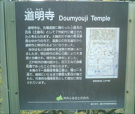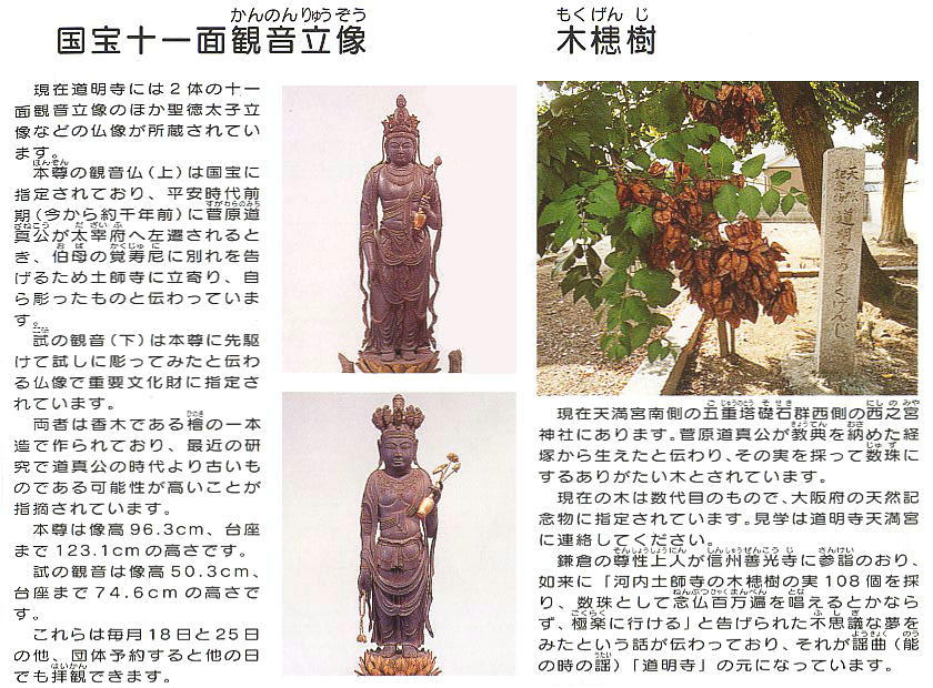 <道明寺・縁起> 当寺は菅原道真公が信心をこめて手ずから刻まれた国宝十一面観世音菩薩像を御本尊とする古義真言宗の尼寺です。 仏法に帰依されるに当り、代々仏教文化導入に積極的であった土師という人が邸宅を寄進し、東西三百二十米、南北六百 四十米の広大な境内に五重の塔、金堂等をはじめとする七堂伽藍の完成を見ました。これが当時の前身土師寺で、その後 菅原道真公に依って道明寺と呼び改められる処となり、数多くの仏像、教典美術工芸品、薬品等を宝蔵しておりました。 土師氏の後裔菅原道真公が太宰府に下向されたるとき、叔母の覚寿尼を訪れて当時に立寄られ一首を残されています。 啼けばこそ別れもうけれ鶏の音の 鳴からむ里の暁もかな 戦国時代に入り、高屋の兵乱に当寺も焼失しましたが、之を惜しむ織田信長、豊臣秀吉、徳川代々の将軍家等の屁護によ って復興成り朱印地に認められました。明治五年神仏分離令に従って堂宇一切を天満宮境内より移し境内の拡張を経て大 正八年には本堂の落成をみ、多宝塔を加えて現在に至っております。建立以来千三百年法燈絶ゆることなく少ない尼寺と して、今日に至っていることは偏に皆様の御信心の賜と存じます。