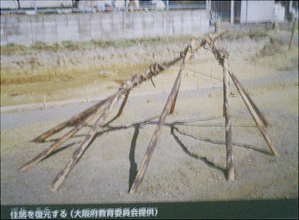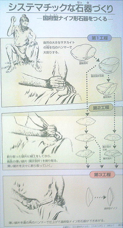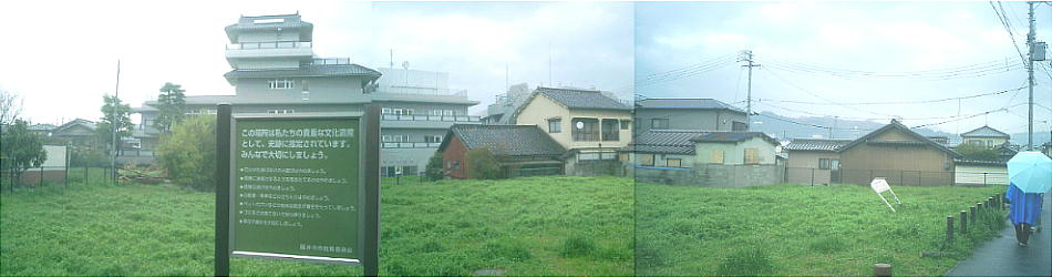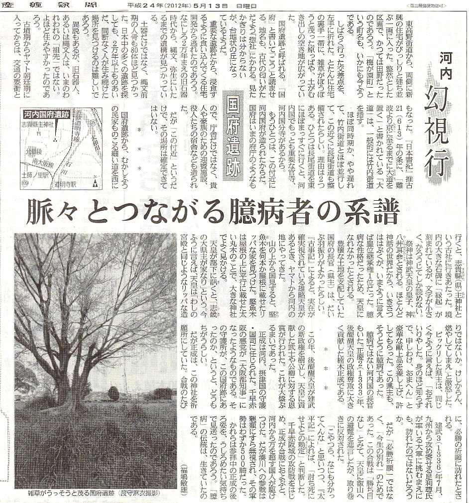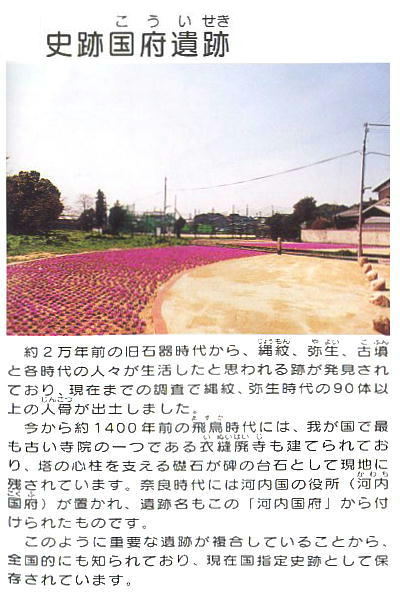 <国府(こう)遺跡> 上記説明にあるように、旧石器時代から続く関西ではまれな遺跡である。旧石器時代のナイフ形石器や、縄文・弥生時代の 人骨が90体以上出土し、考古学史上きわめて重要な遺跡となっている。ここからの出土物は、わたしの住む大阪府吹田市 の関西大学の博物館に多く収められているが、ここの卒業生であるわが歴史倶楽部の河内さんは、在学中はその存在を知ら なかったそうである。 和名抄によると河内国の国府は志紀郡にあったという。古代の志紀郡に属する藤井寺市の允恭天皇陵の東側に国府という地 名があり、その北側に惣社という地名と、神社が現存する。河内国府も、おそらくこの地に置かれたであろうことは、ゆか りの地名が残っていることによって、推定されているが、まだ国府に関係した遺構、遺跡は発掘されていない。この遺跡は その惣社地区にある。