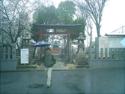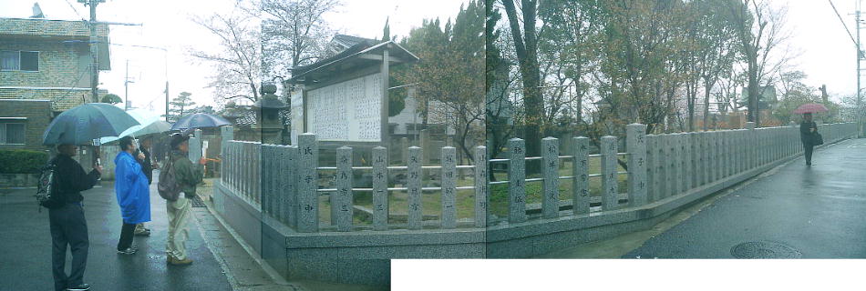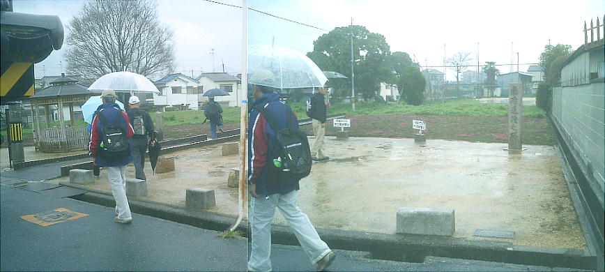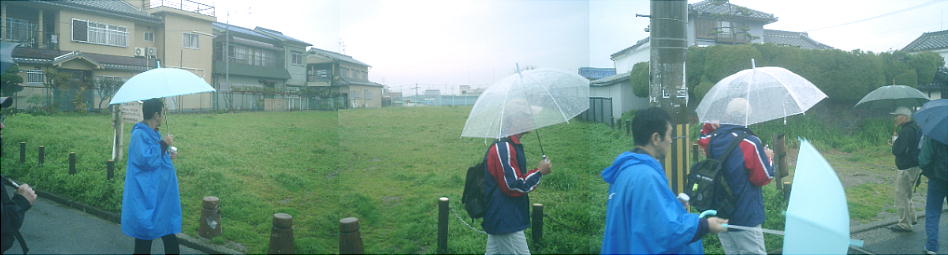 上中央に見える小さな東屋の中で昼食にした。通りすがりの人たちは、例によって「なんや、このオッサンたちは」という 顔で通り過ぎてゆく。一人だと心細いが大勢なら雨の中での食事も楽しい。
