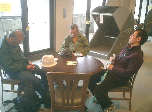 本でも読んでいるのかと思ったら、皆を待ちくたびれて寝てしまったお三方。見事に熟睡している。