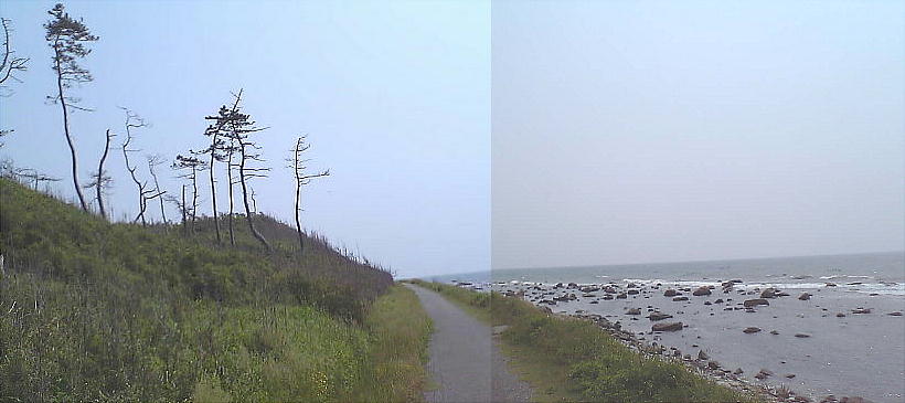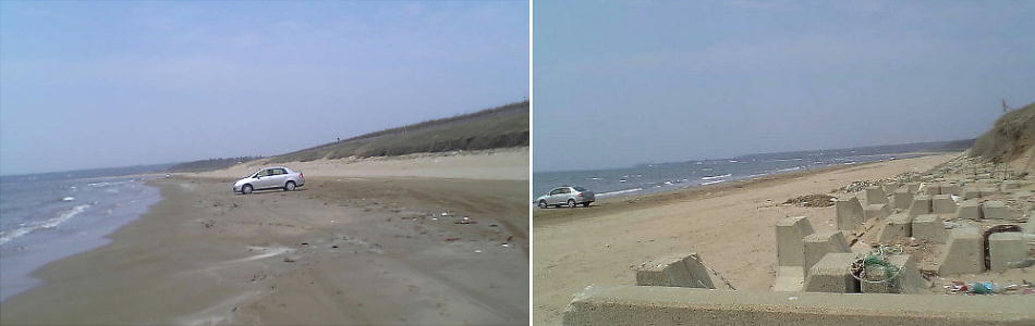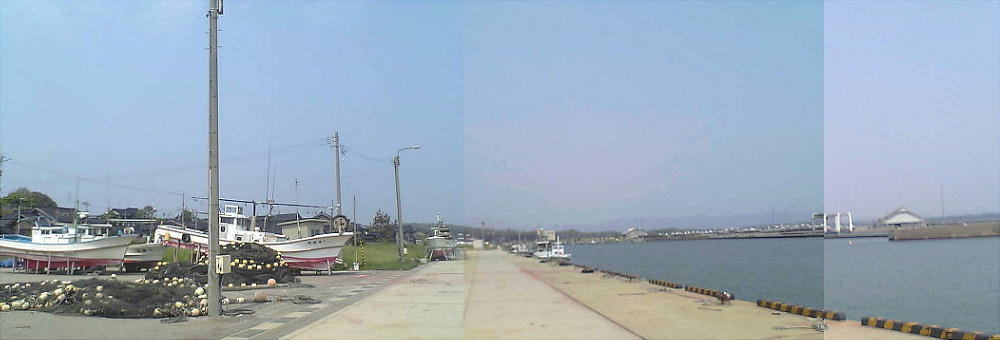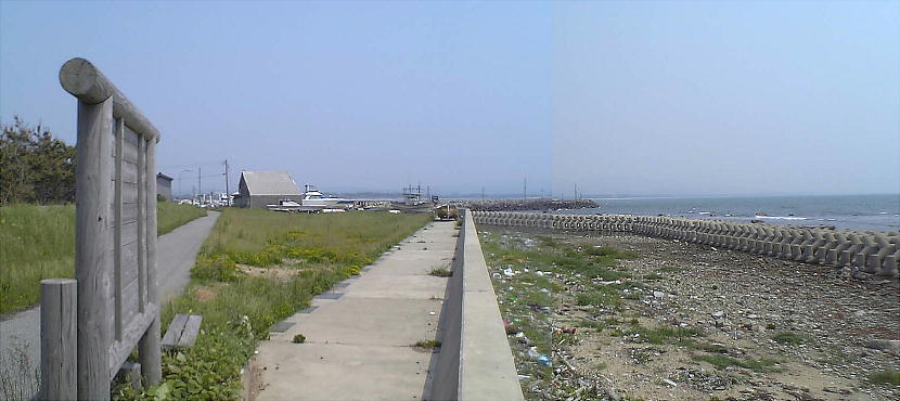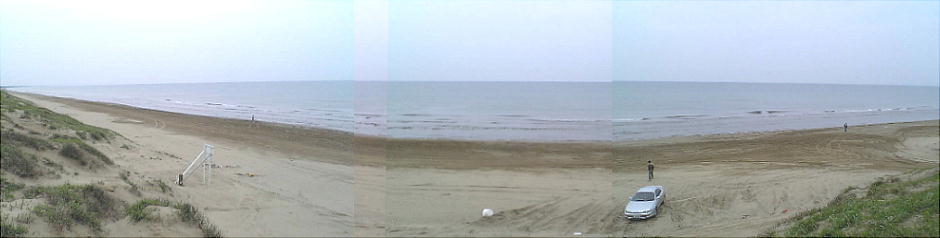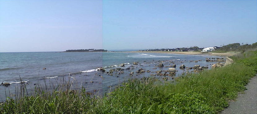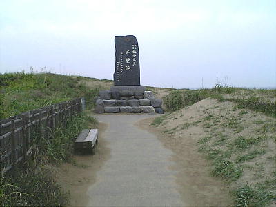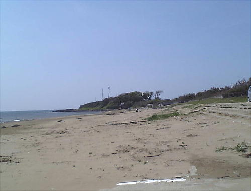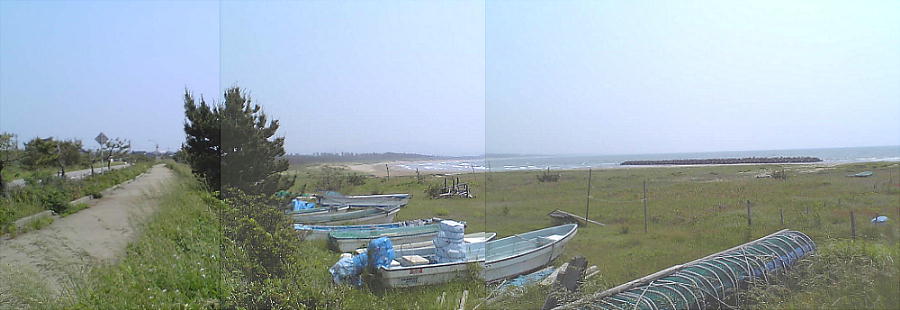 千里浜碑の建っているところからみた海岸線。180度写したために曲がっているが、ホントは一直線の海岸である。
