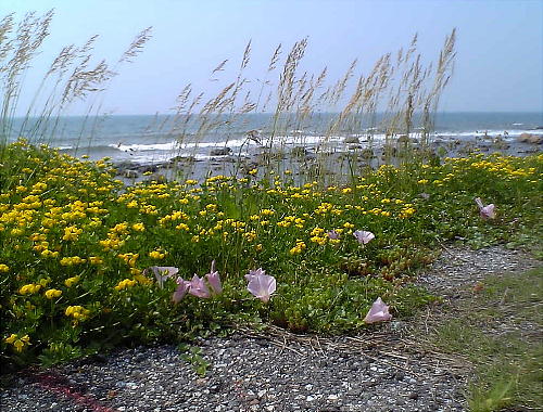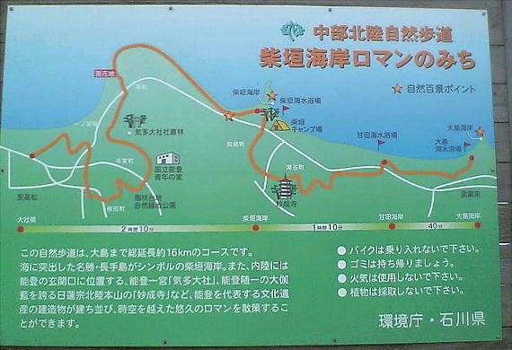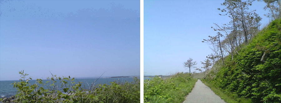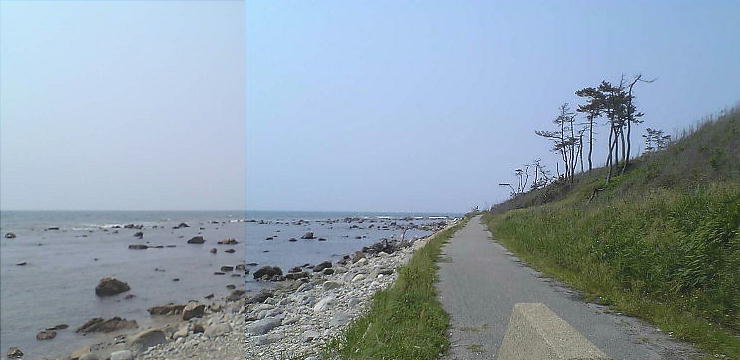 道は実にすばらしい。能登自動車道などは海岸からだいぶ内陸へ入った所を走っているが、自転車道は海岸すれすれを走
