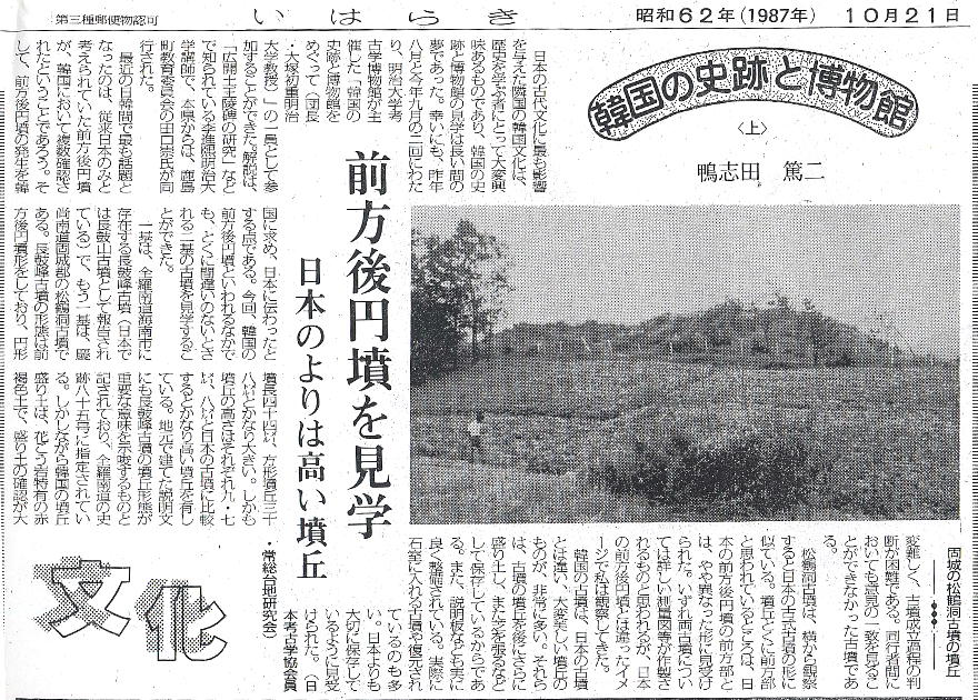 下の記事は、事務室で韓国の前方後円墳の話になったとき、鴨志田さんがくれたもの。「いばらぎ新聞」に書いたものだ