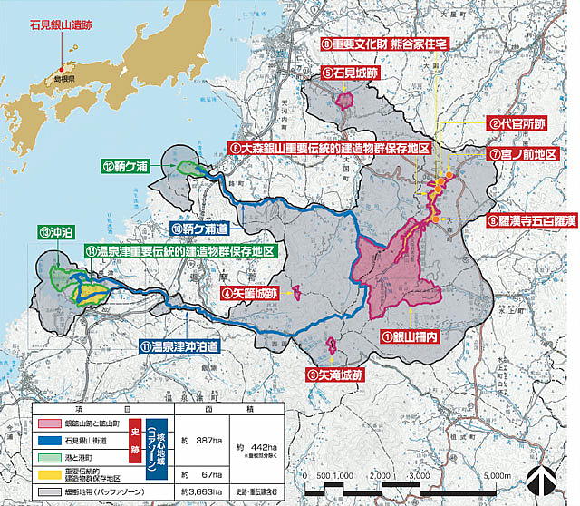 石見銀山遺跡は、東西に長い島根県のほぼ中ほど、旧温泉津町、旧仁摩町を含めた大田市の広い範囲に分布しており、その中心