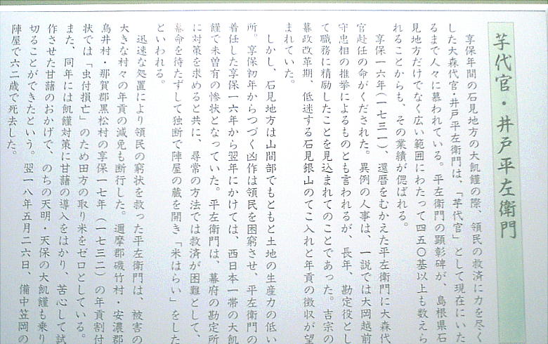 なった。265年の間に59人の代官、奉行が江戸から派遣されて勤務していた。なかでも19代目の井戸平左衛門が、さつ