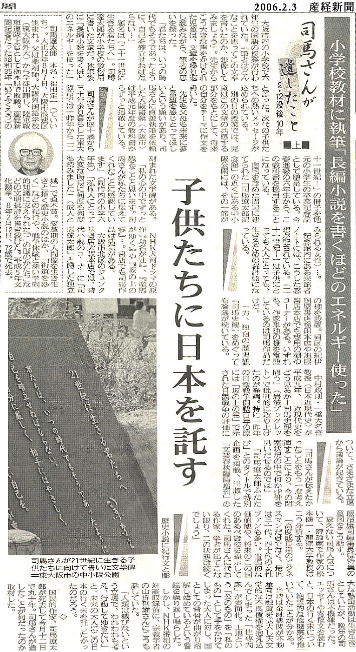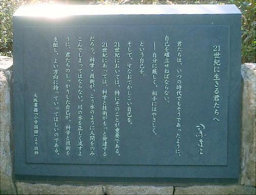 商店街を抜けたところにある小さな「小阪公園」の一角に、司馬遼太郎の「21世紀に生きる君たちへ」という碑がある。