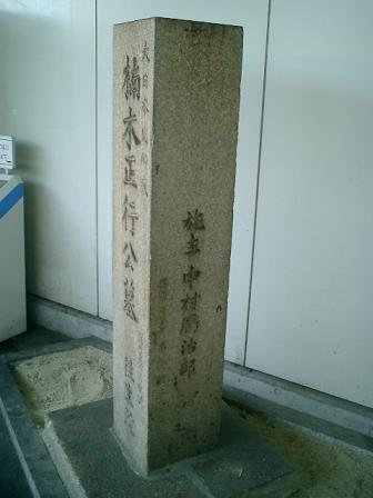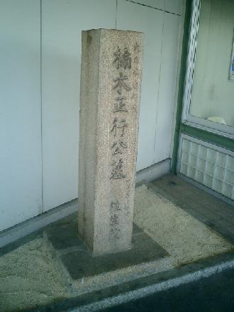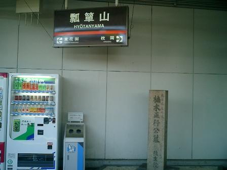 瓢箪山駅のホームに「楠正行(くすのきまさつら)」の墓所(往生院:東大阪市六万寺町:胴塚)の石標が建っている。時間