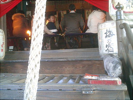 猫ちゃんがどっからかやってきて、賽銭箱の上の煮干しのようなものを食っている。
