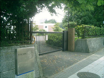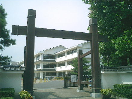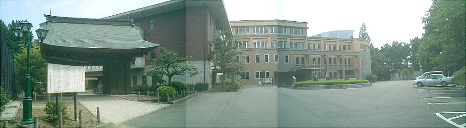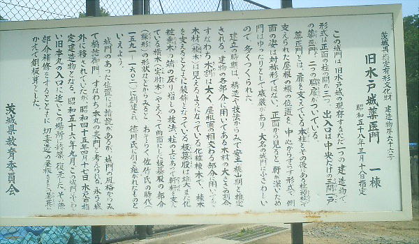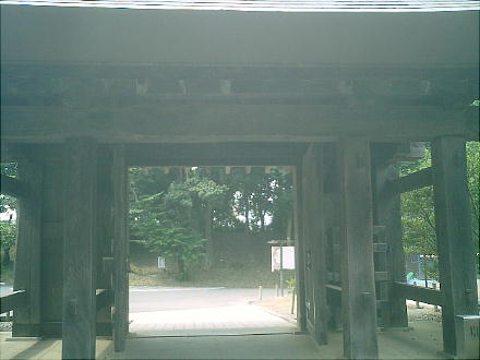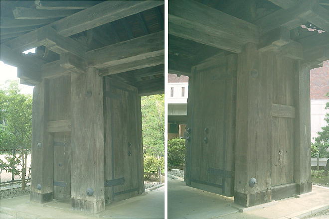 太い柱を持つ三間一戸の薬医門である。現在は銅板葺きとなっているが、本来は茅葺であった。本丸跡は校舎が建ってしま