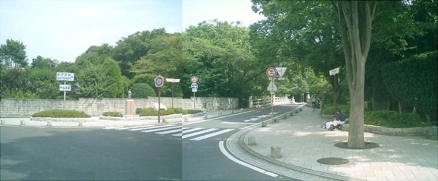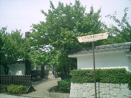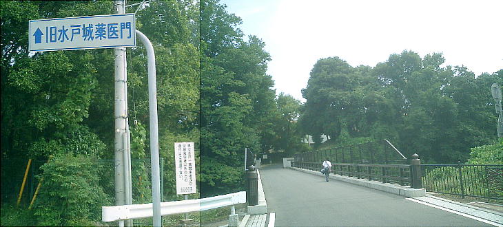 弘道館の前に大手門跡がある。そのすぐ先の二の丸と三の丸の間の空堀跡(現在は道路)にかかる大手門橋を渡ると左右に