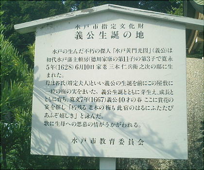 徳川光圀公(水戸黄門)は寛永5年(1628年)に家臣三木仁兵衛之次の屋敷で生まれ4歳まで三木家の子としてここで養育