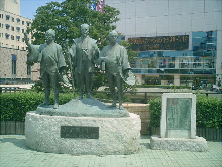 JR水戸駅前の広場に立つ「水戸光圀と助さん格さん像」。