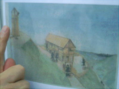 「ここにこういう物見櫓が建っていたんじゃないでしょうかね」と野村さんが復元図を見せてくれる。この遺跡のある場所