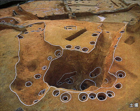 土郭のまん中には東西4m、南北3m、深さ2.2mの土杭があり、内部には数カ所の柱穴があった。土杭の西側には通