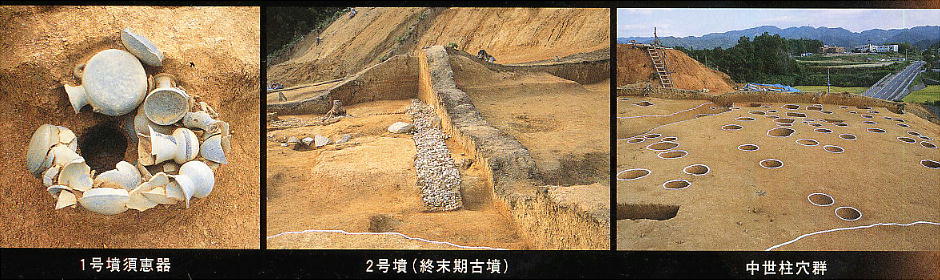 期(5世紀)の二つの時期の古墳群が見つかり、墳丘はすべて中世の水田耕作のために削られてなくなって