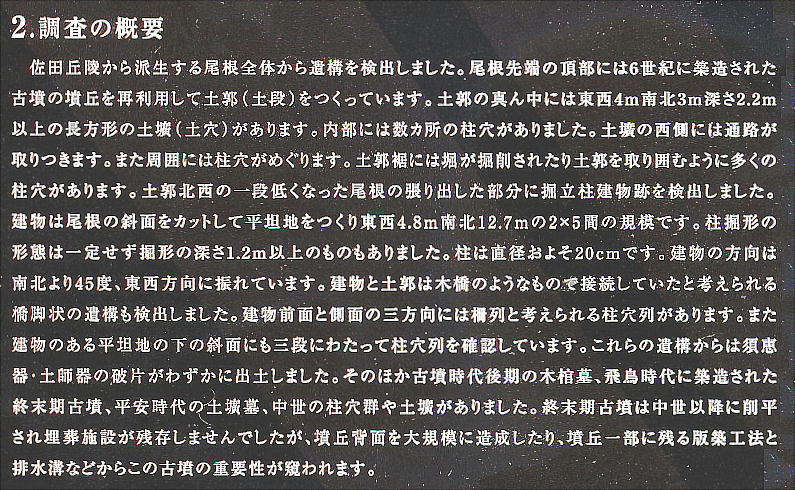する遺跡で、古代の官道「紀路」を見下ろす丘陵上にある。佐田丘陵から派生する尾根全体で遺構が検出された。尾根先