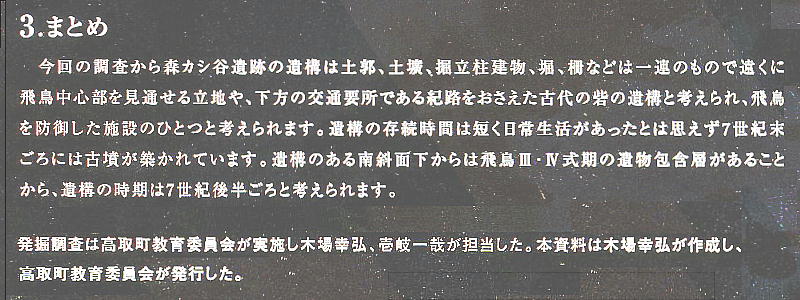 平成15年2月14日高取町教育委員会は、高取町大字森の「森カシ谷遺跡の砦跡」の丘陵南斜面から7世紀末に築かれ
