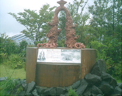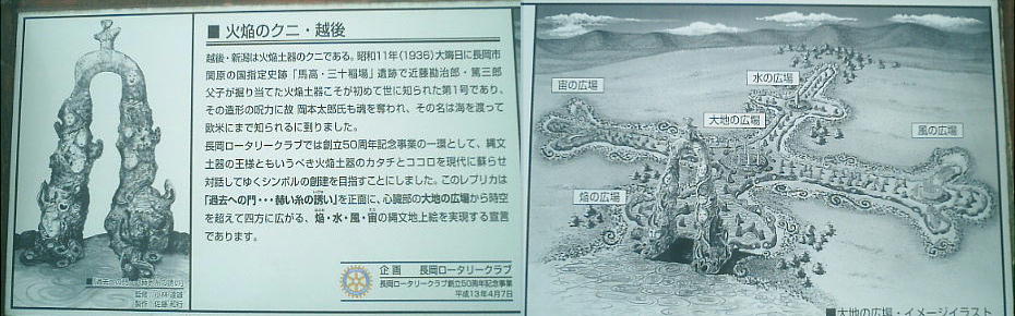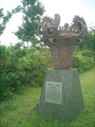 博物館前のモニュメント。上左の「馬高遺跡」出土の火炎土器は有名。遺跡はここから歩いても10分ほどの所にある。帰りに寄った。