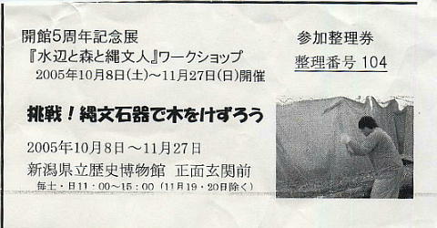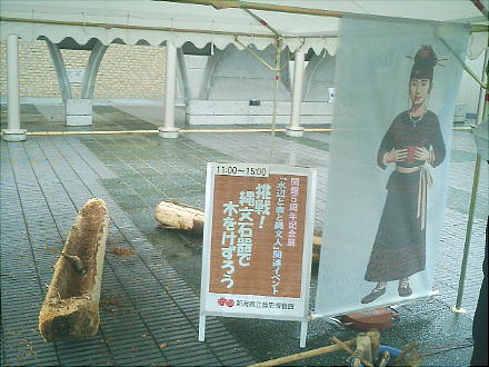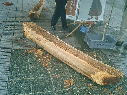 博物館前で、石斧による丸木船作りの実験をやっていた。今日から始まる「水辺と森と縄文人展」を記念してのイベント