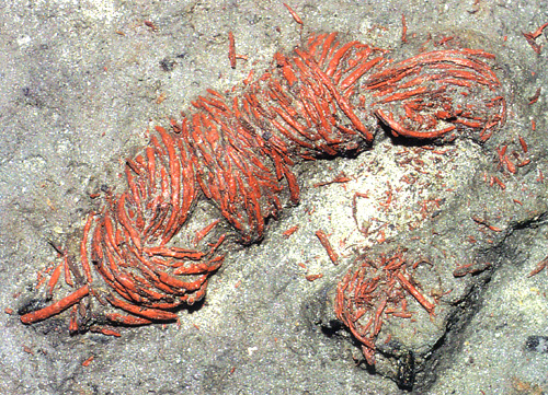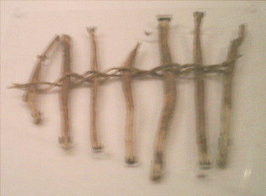 赤い漆を塗った糸をたばねて複雑に結んだもので、さまざまな飾りに使われたと思われる。通常、漆を塗ると糸は硬く固ま