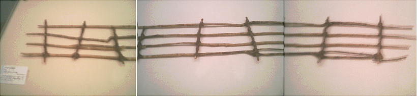 直行して約20cm間隔で6列置かれ、更に枝材を挟むように上から枝を打ち込み固定していた。土壙内にはクルミの花粉が大