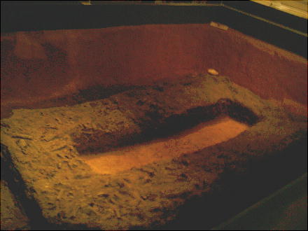 草壁が出土したのは全国で初めて。叉土壙の底面に長軸方向に草材が敷き並べられ、その上に直径1cmほどの枝材が草材と