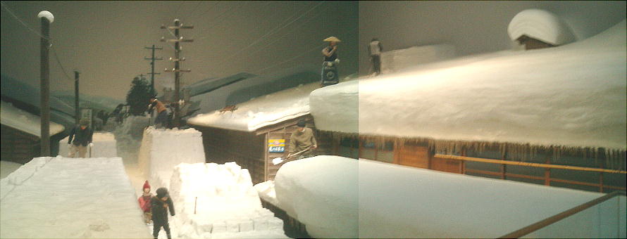 また、雪国の情景を再現した町並みのジオラマもあって、これにも驚いた。ジオラマと言っても、小さな模型ではない。